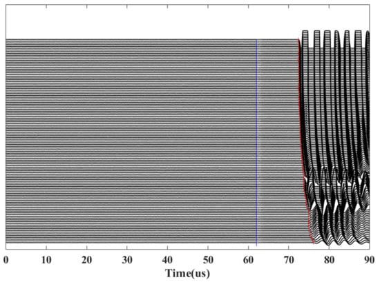 To record the acoustic emission signals generated by hydraulic fracturing during the whole process, 24 piezoelectric sensors (PZT) were installed on the surface of the core, as shown in Figure 3. PZT 1–12 acted as the pulse source emission, while PZT 13–24 served as the receiving sensors. P-waveforms were received by the waveform acquisition system, which consisted mainly of a preamplifier and a 24-channel full-waveform high-speed digital-to-analog converter, with a maximal sampling rate of 100 MHz and resolution of 16 bits. After the 40 dB amplifier, the received signal indicated the corresponding waveform acquisition card. Waves of PZT6-18 (PZT6 acted as pulse source emission and PZT18 acted as the receiver) were shown in Figure 4. We picked up the first arrival of each waveform according to the first motion (red line in Figure 4). Then the travel time was calculated by the time difference between the emission time of the pulse source (blue line in Figure 4), which was decided by the multi-channel acoustic emission wave information acquisition system [34] and the time of the first arrival of each waveform. Furthermore, P-wave velocity was determined by the travel time and the distance between the pulse source emission and the receiving sensor.