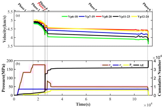 (a) P-velocities measured along horizontal paths as indicated in Figure 3; (b) the procedure of the hydraulic fracturing experiment: the axial compression (σa), confining pressure (σc), inlet fluid pressure (Pi), and cumulative number of AE events versus time. The whole procedure could be divided into six phases according to different stress loading.