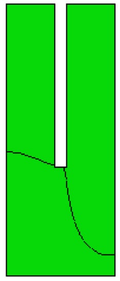 To systematically study the damage process of the rock sample, we performed a series of numerical simulations. In conventional numerical simulations, the values of physical parameters are usually fixed. Rock fracturing simulations were conducted according to the configuration shown as Figure 7. The four node plane strain pore fluid/stress element (CPE4P) in ABAQUS was applied in the simulation. The initial increment of the time step was 0.1 s, and the maximum increment of the time step was 1 s. The initial values of physical parameters used for the simulation are summarized in Table 1. Figure 8 shows the fracture geometry at the end of simulation.