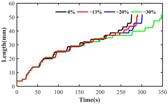 Next, we analyzed the relationship between fracture length and the simulation time. It can be clearly seen that the time when the fracture length reached maximum was different. When the physical parameter (velocity) of the model was changed by 0%, −13%, −20%, and −30%, the time of fractures propagating to model boundaries was 274 s, 290 s, 301 s, and 347 s, respectively, as shown in Figure 9. Furthermore, similar results could be obtained from the numerical simulations [40]. The real fracturing time lasted about 300 s from Phase 3 in Figure 5. It could be clearly found that when we considered real-time evolution of velocity change (−13%), the time 290 s was closer to 300 s than 274 s with constant physical parameter (0% velocity variation), which means that when we considered real-time evolution of velocity change during the simulation, the numerical simulation results could reflect the rock damage evolution more exactly. Additionally, the change of final facture geometries was not clear, considering the evolution of velocity from Figure 10. However, when we analyze Figure 9 and Figure 10 comprehensively, it is not difficult to find that the fracture geometries were different at the same simulation time with the change of the physical parameter (velocity). The fracture length considering the velocity change was shorter than that with constant physical parameters at the same simulation time. Thus, considering that at the field site it is impossible to inject the fracturing fluid all the time, we draw the conclusion that the change of physical parameter (velocity) likely has an effect on the fracture geometry.