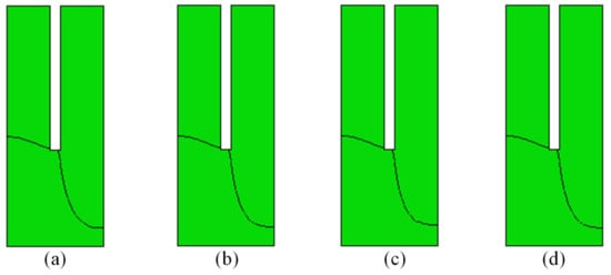 Fracture geometries at different percentages of velocity variation. (a) 0%, (b) −13%, (c) −20%, (d) −30%.