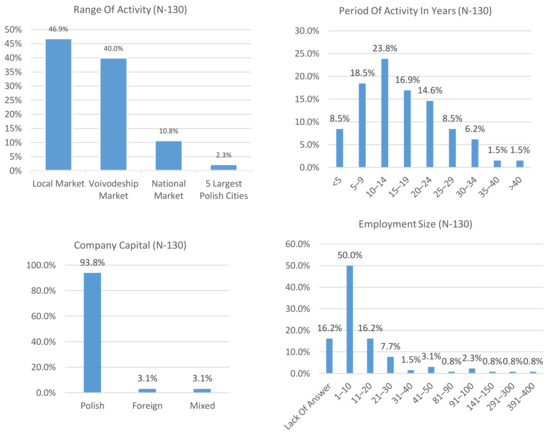 The presented companies were characterized by different years of operation from 5–9 years, for 10–15 years, to 15–24 years. Among the analysed companies, 65 companies employ up to 10 employees, 37 companies have employees from 10 to 49, five companies have employees from 50 to 249, two companies have more than 249 employees while the remaining companies did not want to disclose the number of employees.