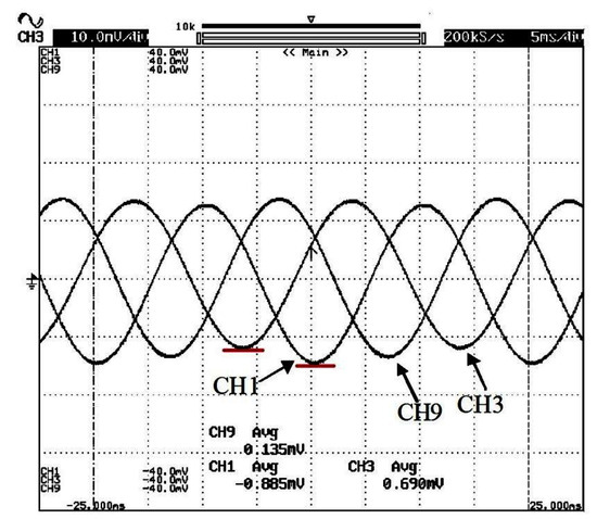 To determine the source of DC offset in the inverter output voltage, control signals are investigated upon the propagation delay time. For this aim, the same pulse sequence is commanded to all inverter phases simultaneously. As expected, control signals measured directly at the output port of the micro-controller are perfectly simultaneous without any lag-time relative to each other.