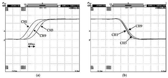 Control signals for three inverter legs measured after the optical transmission [16]: (a) rising edge—light off; (b) falling edge—light on [9].