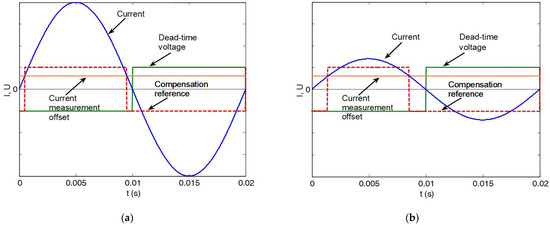 Dead time voltage compensation malfunction caused by current measurement offset: (a) larger current magnitude; (b) smaller current magnitude [3].