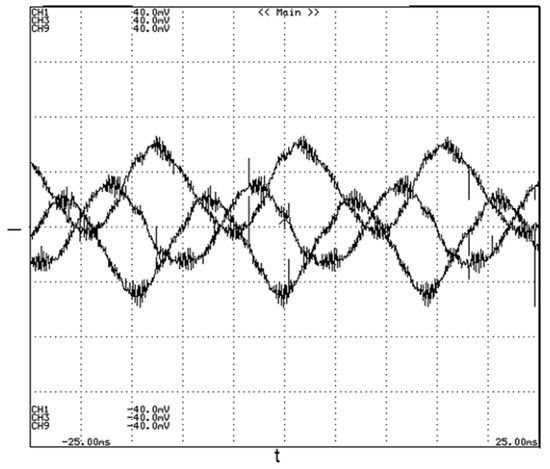 On the contrary, control signals measured at the output of the optical link, behind the optical receiver, have delay time relative to each other. As is shown in Figure 4, the rising edges show time delays of more than 100 ns, and the falling edges are close to each other. That means that, with each switching cycle, an additional non-commanded DC voltage offset between the phases arises, and its magnitude is proportional to the switching frequency and time delay between the signals.