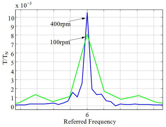 At 220 kW test bench drive, a vice versa behavior of the sixth torque harmonic was observed in [4]—its magnitude increased with higher rotational speeds (Figure 8). The origin of the sixth torque harmonic in that case could be explained by parasitic effects in the PWM-VSI control by operation in the nonlinear area of the machine’s magnetization curve [1,3,6].