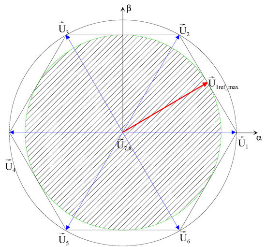 For space phasor modulation of two-level VSI, eight voltage phasors corresponding to eight possible switching states are available. Six of them are active phasors and two are zero phasors, when all phasors switched to the upper or lower DC link bus. Any voltage space phasors within the hexagon are modulated by switching between these eight phasors (Figure 9). In order to obtain the desired circular trajectory, zero phasors must be utilized. Switching between active and zero phasors produces torque vibration. The duration of zero phasors increases in the vicinity of each active phasor and decreases in the middle of sectors formed by active phasors, so it varies six times per period (Figure 8). With the zero-phasor duration variation also, the magnitude of torque vibration of switching frequency will vary six times a period.