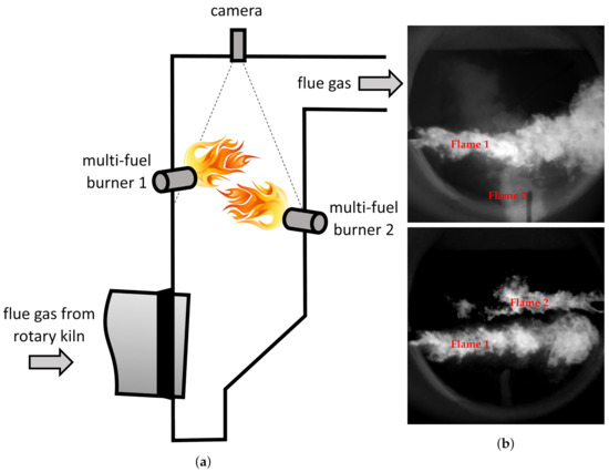 The resource for our investigation is the afterburner chamber in a research plant used for waste incineration as shown in Figure 1. Multiple burners are mounted horizontally in the chamber to treat the exhaust gas from a rotary kiln process. A camera provides continuous top-view images of the process in the visual spectrum.
