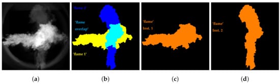 Difference in the class partition between semantic and instance segmentation. (a) Flame image example, (b) corresponding semantic (“instance-like”) ground truth, and (c,d) one partition per flame for instance segmentation. The colors encode class information. In the semantic example each flame segment is a different class (“flame 1”, “flame 2”, “flame overlap”), whereas for true instance segmentation each instance has its own partition of the same general class `flame’.