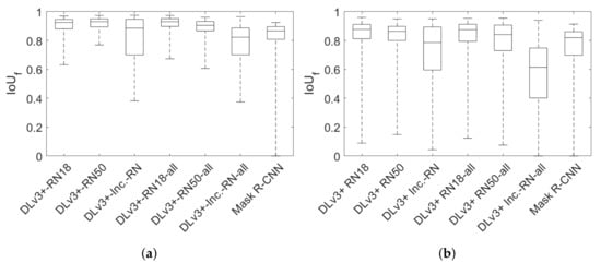 Contrary to expectations, a larger backbone network does not increase the median IoUf results in our experiments. The Inception ResNet v2 backbone network has more weight parameters and performs more operations [31] than ResNet 50, but in Figure 4 DeepLabv3+ Inc.-RN scores lower IoUf results than DeepLabv3+ RN50. Furthermore, the use of a global learning rate of 0.01 does not have a clear positive effect on the IoUf distribution of DeepLabv3+. In our experiment, the median IoUf slightly increases for DeepLabv3+ RN18-all (vs. DeepLabv3+ RN18), but it decreases for DeepLabv3+ Inc.-RN-all (vs. DeepLabv3+ Inc.-RN) and DeepLabv3+ RN50-all (vs. DeepLabv3+ RN50).