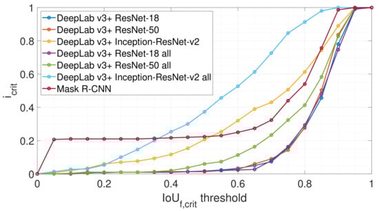 icrit Curves over incremental IoUf,crit thresholds for instance flame segmentation. For each segmentation network we sample icrit at 21 IoUf,crit levels from 0.0 to 1.0. At increasing IoUf,crit, the fraction of critical Images icrit rises, resulting in a characteristic curve for each segmentation method.