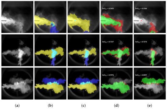 Gallery of instance flame segmentation with CNNs. From top to bottom, the figure shows different image series with increasing IoUf scores at our evaluation. (a) An original image example in our test data set. (b) The corresponding ground truth and (c) segmentation inference with a CNN. The segmentation in the upper two series have been obtained with DeepLabv3+ Inc.-RN. whereas the series at the bottom is produced with DeepLabv3+ RN18. (d,e) Vsualizations of the differences between the ground truth and the prediction of flame 1 (d) and flame 2 (e). The green mark-up indicates matching pixels between ground truth and prediction, whereas red mark-up indicates mismatched pixels.