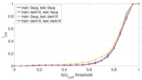 On the other hand, when applying dark10 augmentation during training, we report an icrit curve lower than the scenario (train: 0aug, test: dark10) in both test scenarios (train: dark10, test: 0aug) and (train: dark10, test: dark10)at most IoUf,crit thresholds. In general, the difference of icrit between augmented and unaugmented test data is much smaller between our models which use augmented training data as compared to training with unaugmented data. This indicates an equal adaption of the model to unaugmented and augmented test data. Compared to the bottom-line scenario (train: 0aug, test: 0aug), we do not observe a one-sided positive or negative effect of the training data augmentation on the icrit achieved with our models. In our experiment, the icrit with (train: dark10, test: 0aug) and (train: dark10, test: dark10) is higher or lower than (train: 0aug, test: 0aug) at different IoUf,crit thresholds.