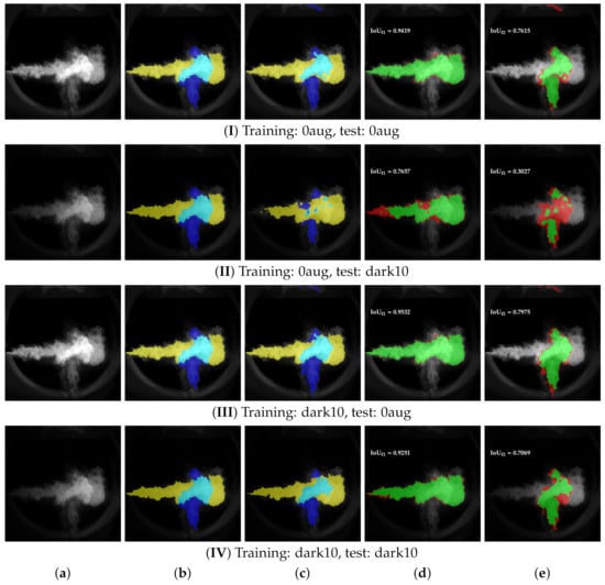 Effect of image augmentation on segmentation. I–IV show series of an image at different conditions of training or test data darkening augmentation as specified underneath each series. In every series image, subfigure (a) shows an original image example in our test data set. (b) The corresponding ground truth and (c) segmentation inference with a CNN. (d,e) Visualizations of the differences between the ground truth and the prediction of flame 1 (d) and flame 2 (e). The green mark-up indicates matching pixels between ground truth and prediction, whereas red mark-up indicates mismatched pixels.
