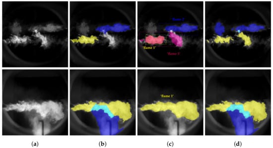 Challenging scenarios with Mask R-CNN in instance segmentation. (a) The original flame image, (b) the ground truth, (c) the segmentation inference with Mask R-CNN, and (d) the segmentation inference with DeepLabv3+ RN18. In the top example, Mask R-CNN detects a third flame instance (purple) on top of flame 1 (yellow, but visually adds up with purple to pink). In the bottom image, only flame 1 is detected by Mask R-CNN.
