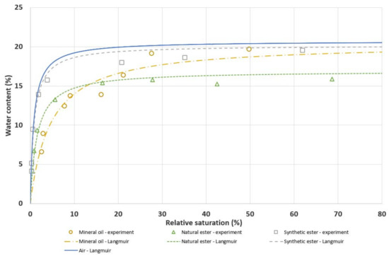 The insulation system is one of the most important elements of a power transformer, and the insulation system’s condition is one of the factors that influences the power transformer’s overall reliability. The insulation systems of grid and distribution transformers are usually made of cellulose materials that are impregnated with mineral oil. This is a proven solution that has been used in power engineering on a mass scale for nearly 100 years [1]. Recently, alternatives to mineral oil, e.g., synthetic and natural esters, have become increasingly popular. Growing interest in these liquids results mainly stems from their high flash point and fire point, and from their biodegradability, while they simultaneously maintain good dielectric parameters that are similar to mineral oil [2,3]. Another parameter that significantly differentiates these liquids from mineral oil is water solubility, which for both natural and synthetic ester at 20 °C is equal to 858 ppm and 1758 ppm, respectively. For mineral oil, this value is equal to only about 47 ppm [4].