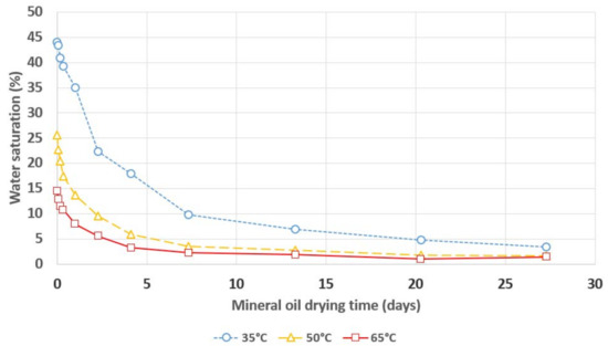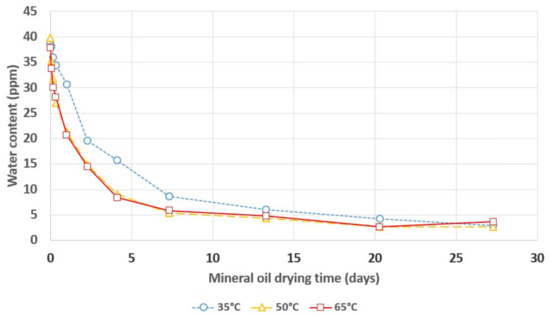 Figure 2 shows that the lowest dynamics of the water adsorption process by MS took place at 35 °C. Increasing the temperature to 50 °C resulted in a significant increase in the rate of water removal from the oil, particularly during the first days of the drying process. An increase in the drying temperature to 65 °C did not cause a further increase in the drying rate of the mineral oil. There was no effect of the drying temperature on the final water content in all of the analyzed mineral oil samples, and only the time needed to reach it changed.