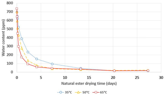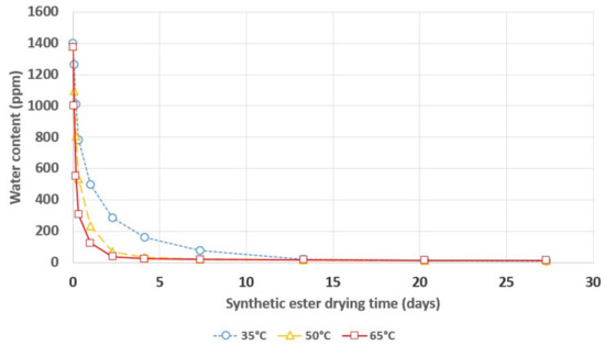 In the case of drying both natural and synthetic ester, an even greater influence of the temperature on the dynamics of the drying process was observed than in the case of mineral oil. The increase in temperature of the electro-insulating liquid caused a significant increase in the rate of water removal from the esters. An increase in the drying dynamics was observed when the temperature increased from 35 °C to 50 °C and when the temperature increased from 50 °C to 65 °C.