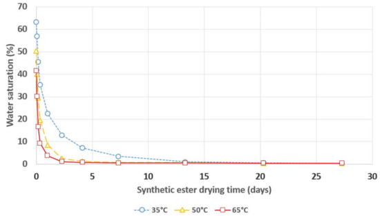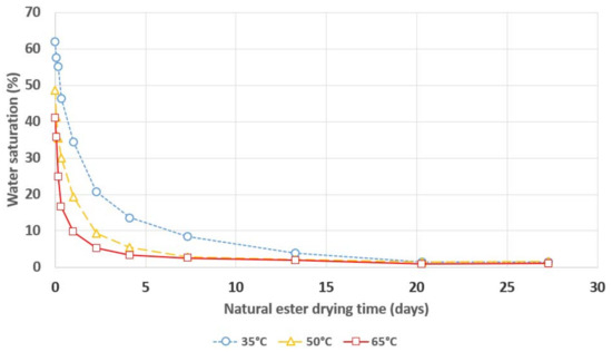 Taking into account the above, Figure 5, Figure 6 and Figure 7 show the changes in relative saturation of the insulating liquids during the drying process. The relative saturation of the insulating liquids was calculated based on the results of the water content in the liquids during their drying. These results were referred to the water saturation limit in mineral oil, natural ester and synthetic ester. The limit values of water saturation used for the calculations are presented in Table 3. These values were calculated on the basis of data contained in paper [4].