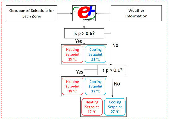 Occupancy data are difficult to acquire and precise ground truth values are rare, as most buildings do not have sufficient infrastructure to sense people accurately throughout the building [35]. The proposed occupancy-based model operates according to the current occupancy information. It uses the occupancy presence profile for describing the vacancy of a zone to come up with an appropriate setpoint for HVAC systems based on the following flowchart: