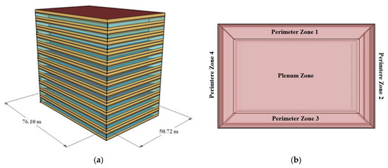 This article’s case study is constructed based on a large office building that is validated by US-DOE. The first three HVAC control algorithms are based on EnergyPlus building simulation models [36]. These rule-based methods feed the pre-defined criteria into the simulation. On the other hand, the fourth model employs the simulation results to generate the initial inputs and then uses this information in the proposed optimization approach. This 12-story building has 61 controlled thermal zones and a floor area of 46,320 m2. These zones include a basement, and five zones (as shown in Figure 4) for each floor. Each zone has a specific temperature profile, since its direction is different. For example, Perimeter Zone 1 is an east-facing zone that definitely has a different daily temperature profile than Perimeter Zone 3, which is a west-facing zone.