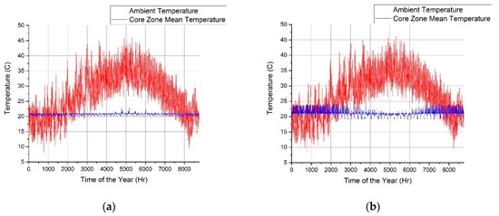 where is the initial surface heat, is the initial temperature setpoint, and is the heat increment that is used for the calculation of heat surface. Moreover, the run time fraction of the HVAC system is approximated based on the linear relationship with the part-load ratio of the cooling system (), as in Equation (24) [36].
