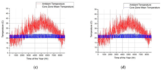 Figure 5a describes that the temperature of the zone is always around the cooling setpoint, and the deviation from the desired temperature is very low. Figure 5b illustrates a steadier indoor temperature during the cooling months. since the cooling systems are operating almost all the time. On the other hand, Figure 5c,d show that indoor temperature variation is noticeable when cooling control methods that are based on occupancy presence are used.