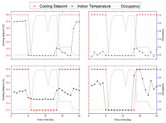 Occupancy schedule, indoor temperature, and optimal setpoint assignment for four selected zones according to the schedule-based model: (top-left) an east-facing zone; (top-right) a west-facing zone; (bottom-left) a south-facing zone; and (bottom-right) a north-facing zone.