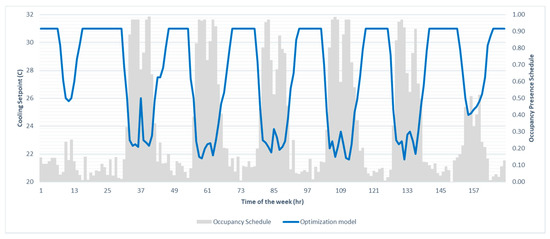 In this Figure, it can be seen that the optimization model is able to capture the occupancy schedule variation by assigning appropriate setpoint temperatures to maintain human comfort while minimizing the cooling energy consumption. Additionally, the setpoint slopes in the optimization model are reasonable. In this model, the following constraint (Equation (21)) helps to reduce the allowable range for the optimal setpoint based on the occupancy schedule, leading to a reduction in the setpoint temperature variation.