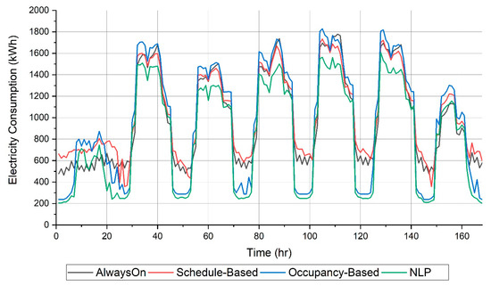 Figure 10 describes the effect of all four cooling control models on the total electricity consumption during a representative week in summer. This figure reveals that the non-linear optimization model has the lowest energy consumption during the time that zones are mostly unoccupied. Besides, it can be seen that energy consumption noticeably increases because of the occupant behavior that results in longer cooling operation time and lowering the cooling setpoint. Another interesting takeaway is that the always-on thermostat works more efficiently than the schedule-based control and it makes the building consume less energy. One of the main reasons for that is that it reduces the need for sudden increases and drops of indoor temperatures. These prompt variations require a great deal of energy to meet the human comfort level inside the buildings.