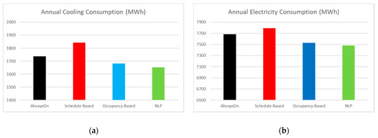 The annual energy consumption comparison for different control models: (a) annual cooling energy consumption; (b) annual electricity consumption.