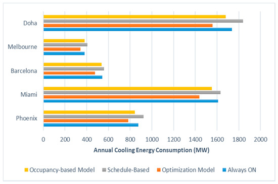 This section analyzes the impacts of the proposed cooling control strategies on the same office building as Section 5.1, but it is located in different cities. This will help to evaluate the effect of different weather conditions and geographical locations on cooling energy consumption. These cities include Miami and Phoenix in the United States, Barcelona in Spain, and Melbourne in Australia. The results for these four cities as well as the results for Doha, which were shown in the last section, are compared and the impact of the applied methods is discussed.