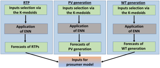 The scope of forecasting processes is the optimal strategic utilization of the prosumer resources in order to reach out in minimal energy costs. In this paper, a method of selecting the proposer inputs for the forecasting model is proposed. The prosumer model is applied to two test cases, namely, the summer day and the winter day. Figure 2 shows the connection of the forecasting processes and the prosumer model. The latter receives inputs the forecasts and is executed every time step. The proposed forecasting model refers to a combination of unsupervised and supervised machine learning algorithms. The unsupervised machine learning part corresponds to clustering. The K-medoids algorithm is employed for proper selection of the training inputs [26]. The supervised part refers to the Elman neural network (ENN) [27]. The role of ENN is to perform the forecasts of the three variables. Figure 3 displays the flowchart of the hybrid forecasting model. The same model is used for all variables. The difference lies on the types and number of inputs of the ENN. Let be an input pattern of the ENN, where denotes the th component of the feature vector The data are normalized in the [0, 1] range by dividing each element of with the maximum value among the values. The normalization aids at the better exploitation of clustering results. In the clustering procedure, the scope is to group together patterns with similar characteristics. In the case of Real-Time Prices (RTP) and generation, the similarity lies on the similarity of the time series shapes. The pattern corresponds to the time series that cover a 24 h period. K-medoids is applied for the proper selection of historical data that will be used for the training of the ENN. Let be the target day of forecasting, i.e., either the summer or winter day. The training input selection process is composed by the following steps: