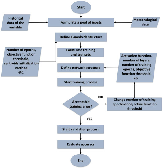 For ENN, the following structure is selected: one hidden layer, resilient back-propagation training algorithm, tangent sigmoid activation function for the neurons of the hidden and output layers, number of epochs 500, and objective function threshold improvement 10−6 [29]. The training error refers to mean absolute percentage error (MAPE) [30].