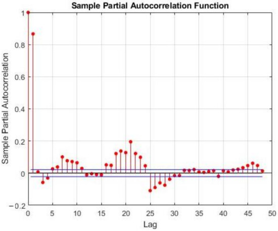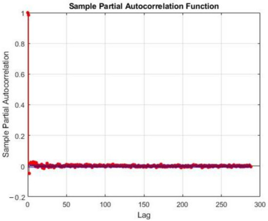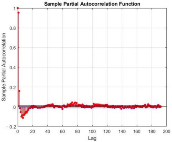 where is white noise. The model is represented as ARIMA(,,), where is the number of differentiation needed for the time series to become stationary. In order to select the order of the model, the sample auto-correlation function (SAF) and sample partial auto-correlation function (SPAF) are checked. Figure 5 presents the SPAF for the RTP, and Figure 6, Figure 7, Figure 8 and Figure 9 present the SAF and SPAF of PV and WT generation, respectively.