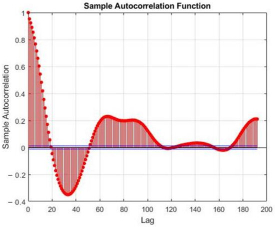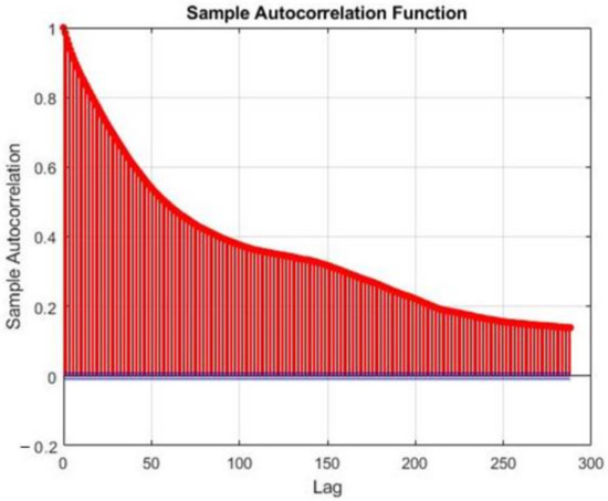 Sample auto-correlation function (SAF) for photovoltaics (PV) generation of summer day.