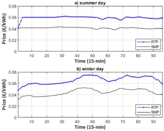 The above process leads to the selection of the most similar days to day , which refers to the target day. According to Figure 3, external variables are utilized as inputs. For the RTP forecasting process, the RTPs of the two test days are predicted using only historical values. More specifically, it is regarded that the prosumer purchases electricity from a retailer. The RTP is the forecasted system marginal price (SMP) increased by 65%. This increase is necessary for the retailer to cover its operational expenses and witness profit. RES generation includes photovoltaics (PV) and small wind turbines (WT). Let , and be the RTP, PV generation, and WT generation of time instance respectively. These variables refer to the outputs of the forecasting model. Table 1 presents the outputs and the inputs of the model. The forecasts of PV and WT generations include external variables, namely, mean daily temperature of day, , clearness sky index of day and mean daily wind speed of day The selected time lags and are selected via correlation analysis. Figure 4 presents the correlation coefficient curves for the two test days.