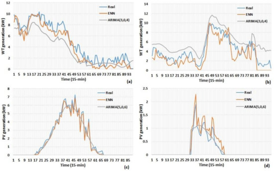 In order to fully evaluate the performance of ENN, a comparison takes place between ENN and an auto-regressive integrated moving average (ARIMA) model [31]. Prior to its implementation, the order of the model needs to be defined. Let be the value of variable in next hour The ARIMA model treats future values of the variable as a linear combination of historical values. ARIMA is composed of the sum of auto-regressive (AR) and moving average (MA) components. The AR(p) component is obtained by the following expression: