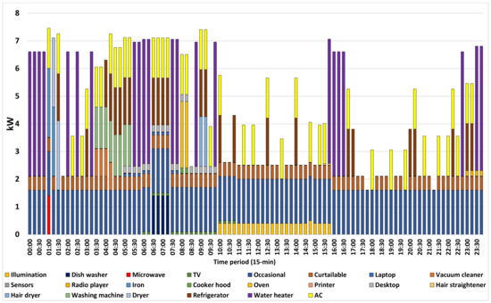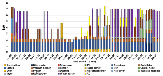 Figure 19 shows the optimal demand allocation of the smart home appliances’ scheduling in each period of the summer day, satisfying the user’s time preferences simultaneously. The total daily load equals around 115 kWh, peak load amounts to 7.46 kW at 15:00, while the lowest load, being equal to 1.61 kW, is reported at 09:00 and 09:45 when only uncontrollable power loads and sensors are activated. A striking difference with the winter day’s corresponding allocation is the relocation of the peak loads towards the second half of the day. In particular, the household’s consumption exceeds the level of 6 kW for 31 15-min time intervals during the second half of the day (12:00–00:00) and ten 15-min time intervals during the first half of the day (00:00–12:00). The winter day’s corresponding values are 31 15-min time intervals during the first half of the day (00:00–12:00), and seven 15-min time intervals during the second half of the day (12:00–00:00). This is also reflected in the overall demand allocation. In particular, around 46% of the total daily load is activated during 16–24 h, followed by almost 28% in 0–8 h and 26% in 8–16 h. The total daily net cost, namely, expenses for acquiring the grid’s electricity minus revenues from selling renewable electricity to the grid, for the smart home’s operational scheduling leads to small expenses of around EUR 7.80.