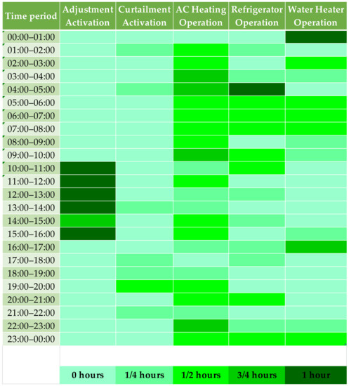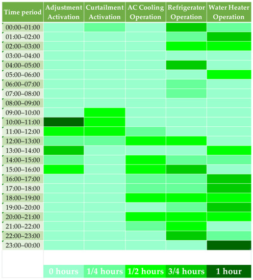 Figure 20 highlights the operational schedule of adjustable, curtailable, and thermostatic loads in each period of the summer day. The adjustment option of the adjustment load activates for 13 15-min time intervals (3.25 h in total), especially during the period 10–16 h. The curtailment load’s total curtailment load occurs during eight 15-min time intervals (2 h in total) of the day, especially between 09:45–11:00. Air-conditioning in the cooling option (for 3.5 h), refrigerator (for 7.5 h), and water heater (for 7.5 h) remain operational during several hours of the day to maintain the temperature settings.