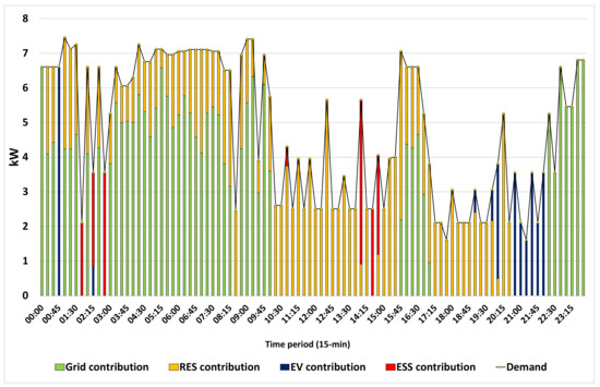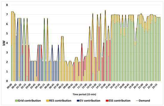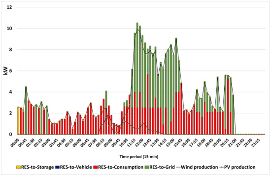 Figure 15 depicts the optimal generation mix to satisfy home appliances’ power consumption on the winter day. As can be observed, grid power covers the largest part of the home loads during the majority of hours (51% in total at a daily level), and on-site RES generation meets almost 39% of the total at a daily level. It is also worth mentioning that the combined RES availability, based on the forecast conducted, is zero in 21–24 h. EV contributes around 6% of the whole load, covering the home’s consumption in the period 20:45–22:00 when the PV availability is zero, and wind is at relatively low or even zero levels. During the last seven time intervals, from 22:15 to 24:00, electricity imports the whole household load from the grid cover alone. Finally, ESS covers the remaining 4% in the energy contribution mix with relatively high percentages during several 15-min time intervals between 2–3 and 14–15 h.