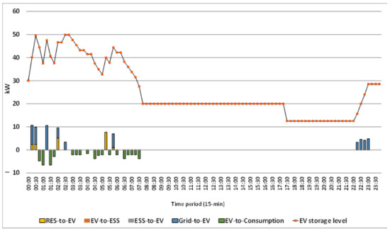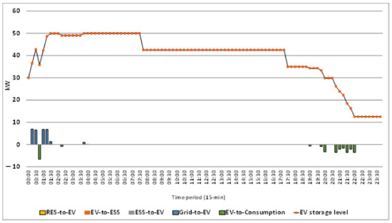 According to Equation (15), the amount of EV charging power () equals the charging power from the power grid (), the ESS (), and the component of RES generation directed to the EV ().