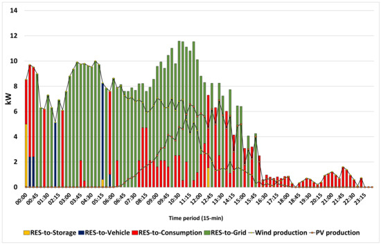 Due to the existence of the constraint stating that the home cannot import and export energy simultaneously at the same period, renewable energy sales to the grid occur only during periods when the on-site infrastructure, ESS and EV, can cover the household load alone and/or in combination between them. Figure 16 represents the renewable energy balance highlighting the flows in each time period of the winter day. It can be seen that the majority of electricity exports to the grid occur when there is increased PV availability, namely, in the period 10–16 h.