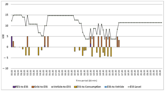 Figure 23 depicts the state-of-energy in the ESS on the summer day. The main contributor for the ESS charging is the power grid and a small amount of RES generation. The most considerable quantities of ESS discharging are reported in the period 10–16 h, contributing to the demand satisfaction, in combination mainly with on-site RES generation.