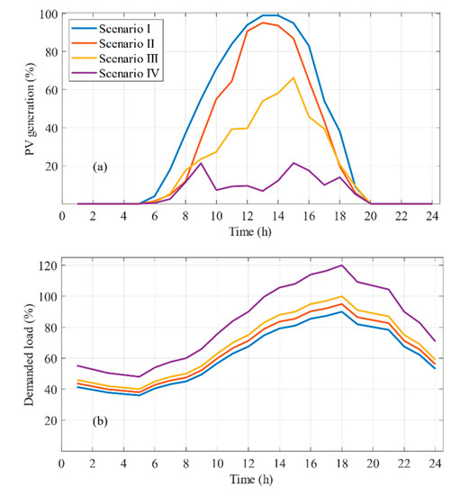The price of the energy purchased of PV generation is considered 0.07 $/kWh. Additionally, Figure 4 the stochastic scenarios related to solar and load power as well as the energy price at the substation; all the information was taken from [36], whereby four scenarios are assessed to represent different conditions of solar irradiance, from a clear day (scenario I) to a cloudy day (scenario IV), thus resembling variations of PV generation. Figure 4b shows the daily variation of the demands for each of the four scenarios. Note that scenario I (the highest PV generation) has the lowest load, which would lead to higher voltage rise at noon. On the other hand, scenario IV (the lowest PV generation) has a peak load at 18 h (higher than nominal), resulting in a higher voltage drop. That combination of scenarios allows the evaluation of those opposite operation states within the optimization problem.