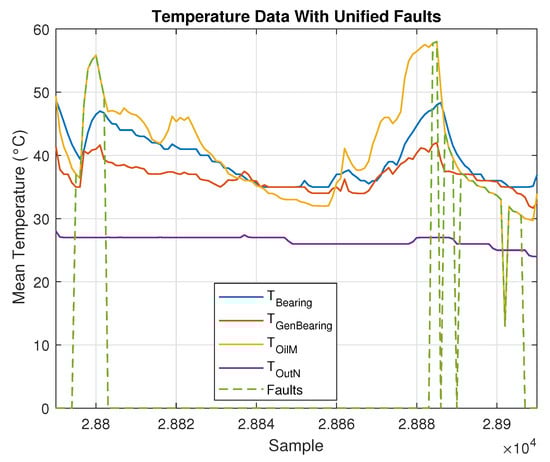 The complete period of faulty observations can be identified after comparing the date and time of each alarm log from the alarm report with the date and time of the monitoring data. Thus, all data between the ON and OFF states are considered faulty. This process adds a vector of labels to the dataset, wherein 1 indicates that an observation is classified as faulty, and 0 indicates a healthy observation. For visualization, and considering that the alarms are related to the gearbox temperature, faulty observations were plotted along with the oil temperature variables, as shown in Figure 2 and Figure 3.