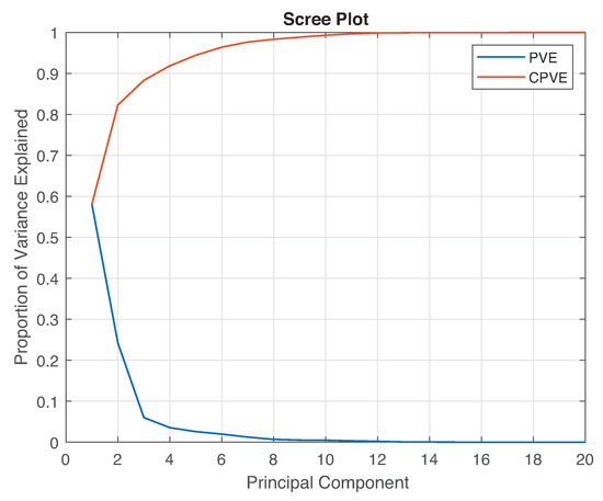 For a comprehensive study of these datasets and the effect of the PCA model, the proportion of variance explained (PVE) or explained variation is used. The PVE measures the proportion at which a mathematical model affects the dispersion of a dataset. The PCA is used to analyze the distribution of information among the PCs to select components that can be discarded. Several tools have been proposed to study the explained variations. For example, the scree plot is a graphical tool built by plotting the individual explained variances of each PC along with the cumulative PVE (CPVE) obtained by adding the PVE of each PC individually. The PVE associated with the jth principal component is