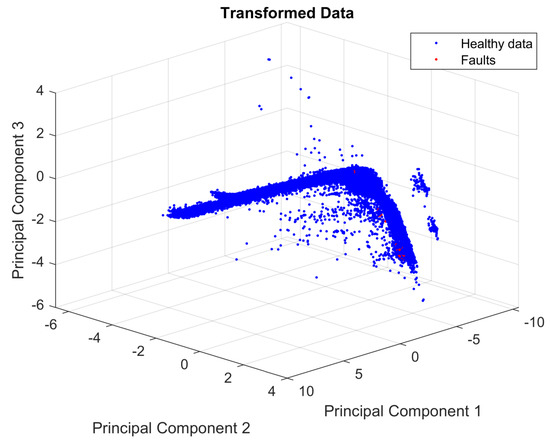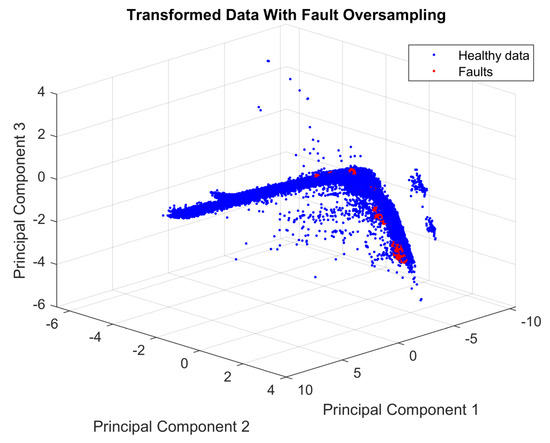 To observe the distribution of the faults and healthy data, the first three PCs are plotted, as shown in Figure 5. Figure 5 shows the large difference between the number of the members of each class (healthy and faulty). This is a highly imbalanced dataset containing 29,459 healthy observations and only 29 faults—a condition that can lead to a bias toward the healthy class when using the dataset to train an ML algorithm.