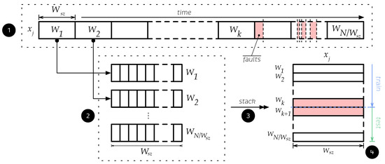 The second technique is a data augmentation method based on data reshaping. Data augmentation works by increasing the number of available samples without increasing the size of the dataset. It is frequently used to enhance deep learning algorithms that use images [38,39]. The performance of these algorithms depends on the shape and distribution of the input data. Thus, different reshaping techniques have been developed to improve their effectiveness [40]. Studies have been performed on reshaping time-series data. For example, acoustic signals have been reshaped as a matrix by following the same principles used by deep learning algorithms with images [41], whereas multisensory time series data have been reshaped for tool wear prediction [42]. A data-reshaping technique for time series data was proposed based on these ideas. This technique is similar to the one used with acoustic signals, which encapsulates the time series by creating a new matrix for each time window to add more information to each observation without increasing the size of the dataset. Several time window shapes are proposed to determine their effect on each classification algorithm, and the most appropriate one for SCADA data are selected. This technique can be used with the random oversampling technique if the data remain imbalanced after processing. These techniques are described in detail below.